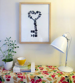 Fun with little things laying around in the junk drawer. Make and old fashioned key design. Lay you Items out on cardboard and spray paint them so they are all the same color. These are done in black, but if you doing a girls room pink is nice. Then arrange the pieces on a canvas glue them in place. I love the clear silicone found in any Walmart in the paint/caulking area. Frame it or not? Paint the frame to match for a bed room. Let your mind wonder it is fun. Look closer at the key and you will find that we all have this junk laying around. if you don't ? start picking it up when you walk the dog, in the parking lot on the way to the store. Hardware is everywhere.